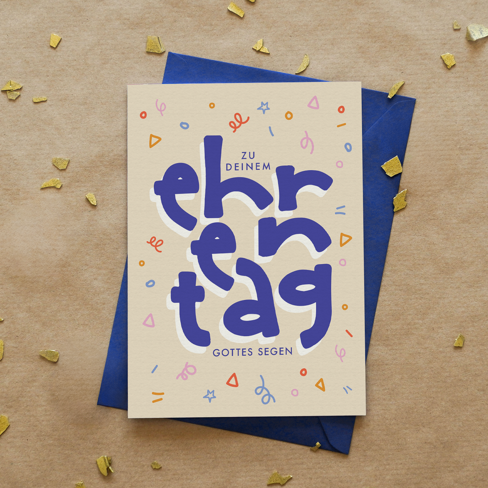 Eine fröhliche, modern gestaltete Faltkarte zum besonderen Ehrentag – ideal für Geburtstag, Jubiläum oder andere persönliche Meilensteine. Die verspielten Farben und das handschriftliche Typografie-Design verleihen ihr Leichtigkeit und Freude. Der Wunsch nach Gottes Segen macht die Karte zu einem wertvollen Gruß für Menschen jeden Alters.Text: