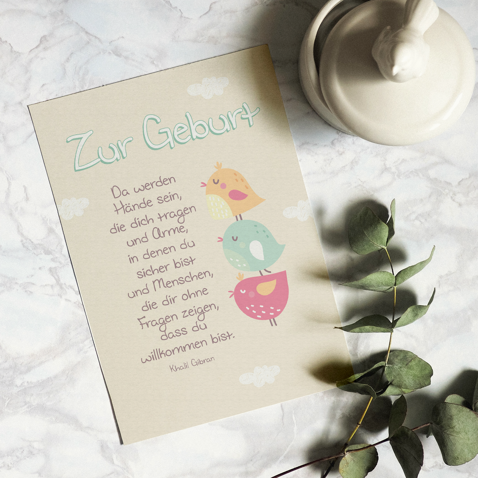 „Zur Geburt - „Da werden Hände sein, die dich tragen und Arme, in denen du sicher bist und Menschen, die dir ohne Fragen zeigen, dass du willkommen bist. – Khalil Gibran“