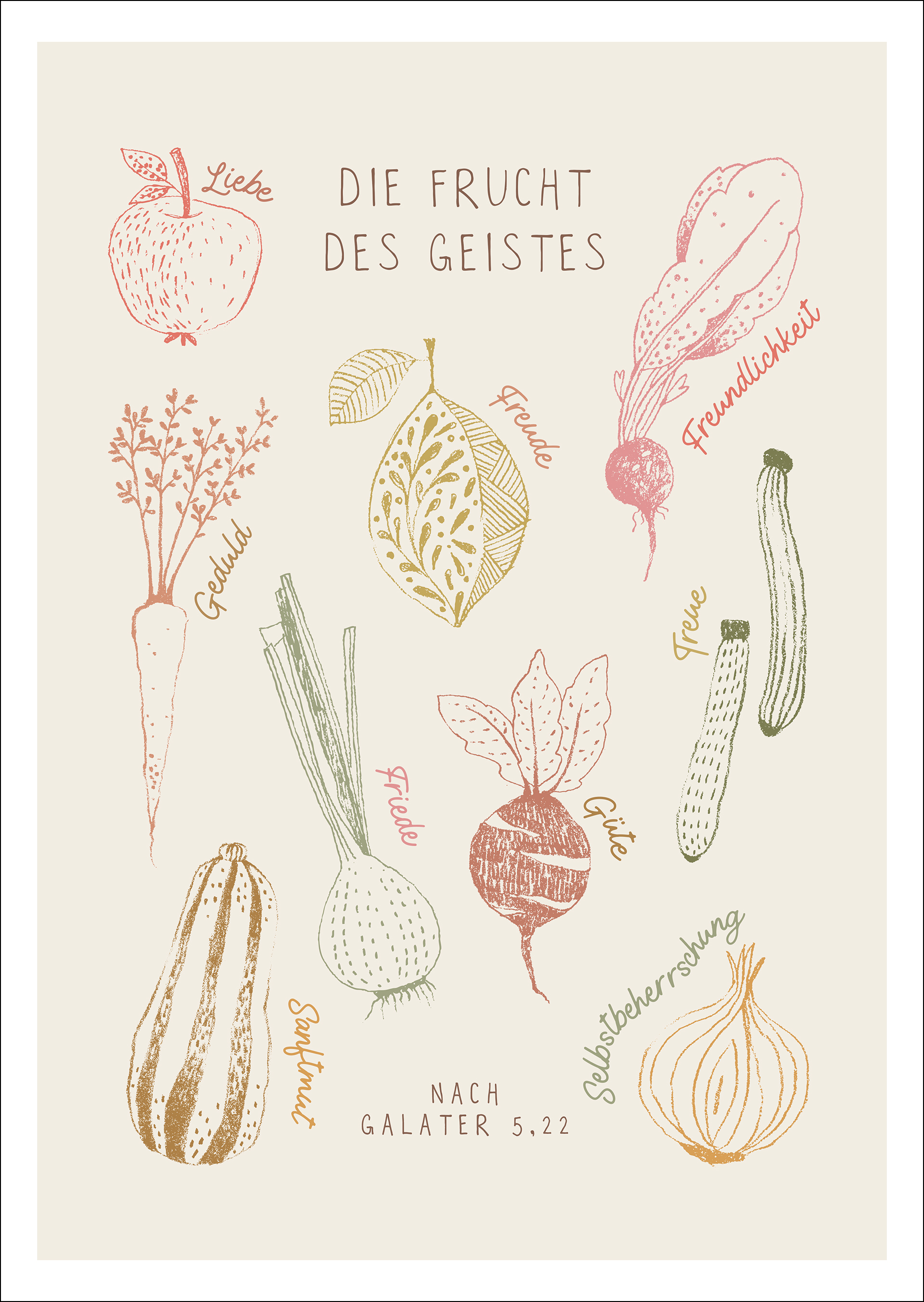 Dieses kreative und humorvoll illustrierte Poster verbindet biblische Werte mit liebevollen Gemüse- und Fruchtzeichnungen. Eine dekorative und zugleich inspirierende Wandgestaltung, die an die Frucht des Geistes erinnert – ideal für Küche, Esszimmer, Kinderräume oder Gemeindebereiche.
