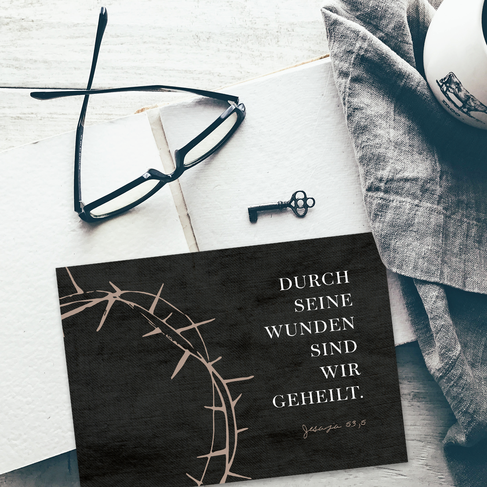 Eine edle, dunkle Karte mit stilisiertem Dornenkranz und eindrücklicher Schrift – die kraftvolle Zusage aus Jesaja 53,5 steht im Zentrum. Eine würdige Karte für geistliche Ermutigung, Karfreitag oder Trost.