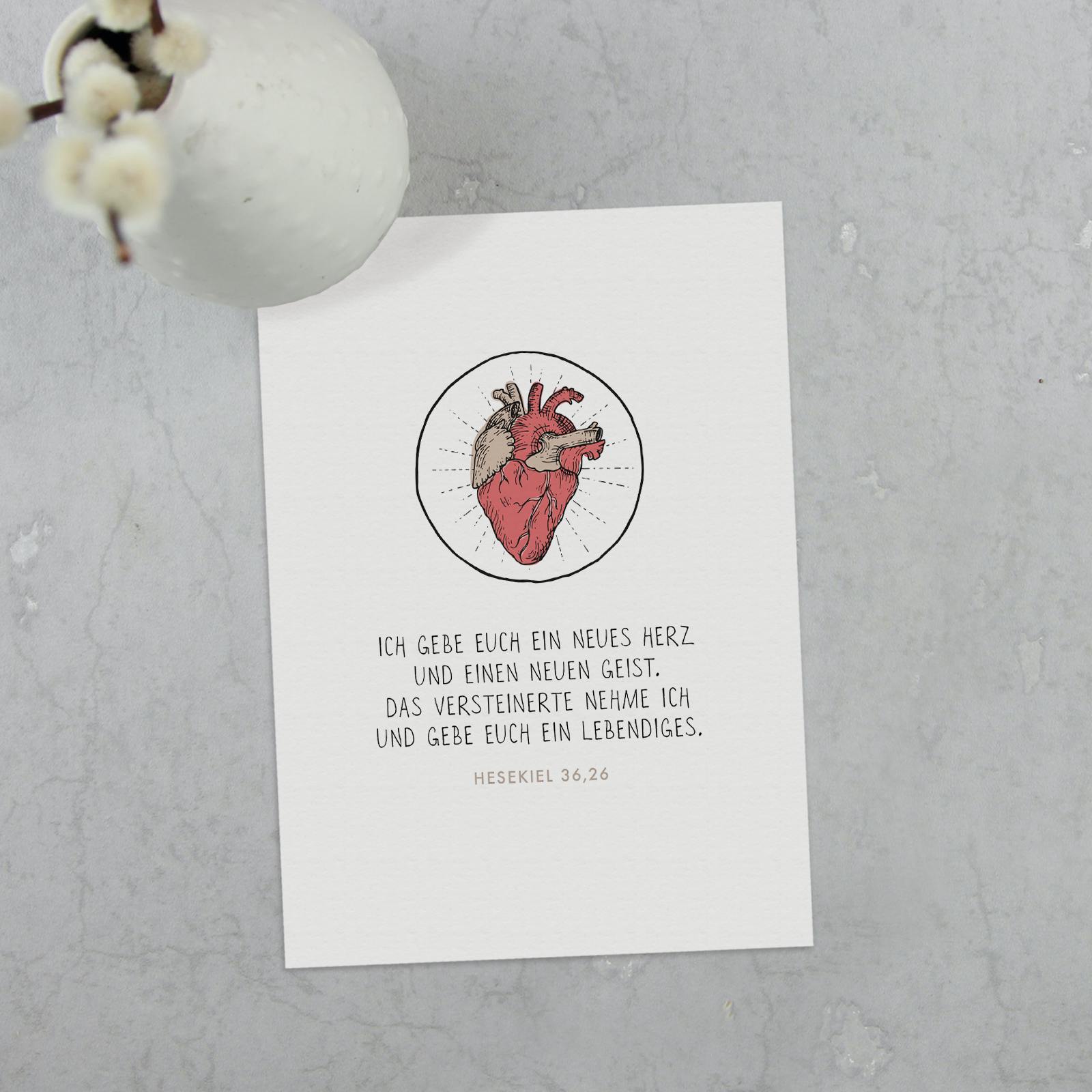 Ein detailreich illustriertes Herzmotiv kombiniert mit einer kraftvollen Zusage aus Hesekiel 36,26. Diese Karte eignet sich besonders für geistliche Ermutigung, Neubeginn oder Segenswünsche.