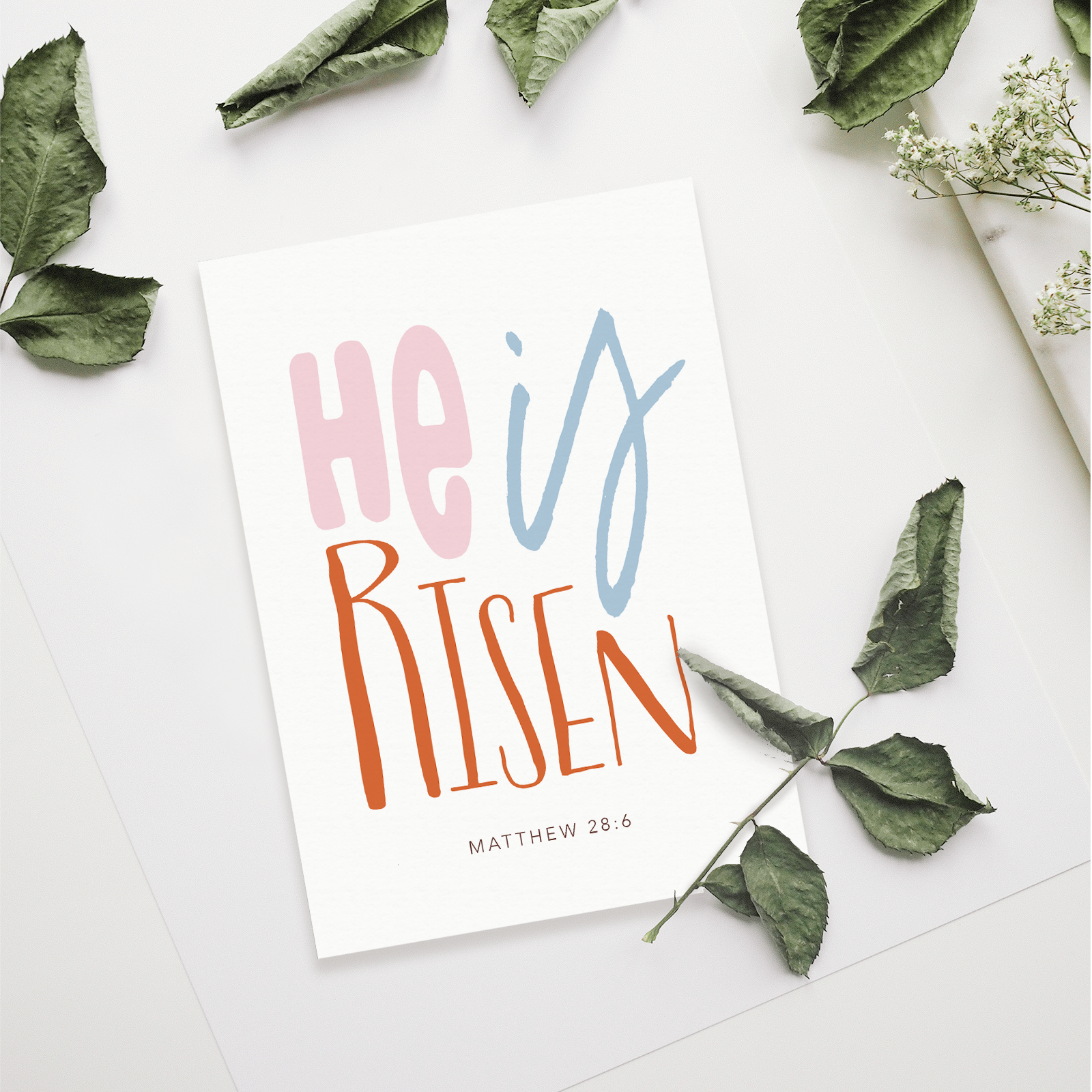 Eine moderne Osterkarte mit frischen Farben und starker typografischer Wirkung. Die Botschaft aus Matthäus 28,6 erinnert an die zentrale Hoffnung des Evangeliums und ist ideal für Ostergrüße oder als geistliche Ermutigung.