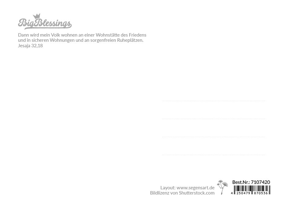 Text auf der Rückseite: Dann wird mein Volk wohnen an einer Wohnstätte des Friedens