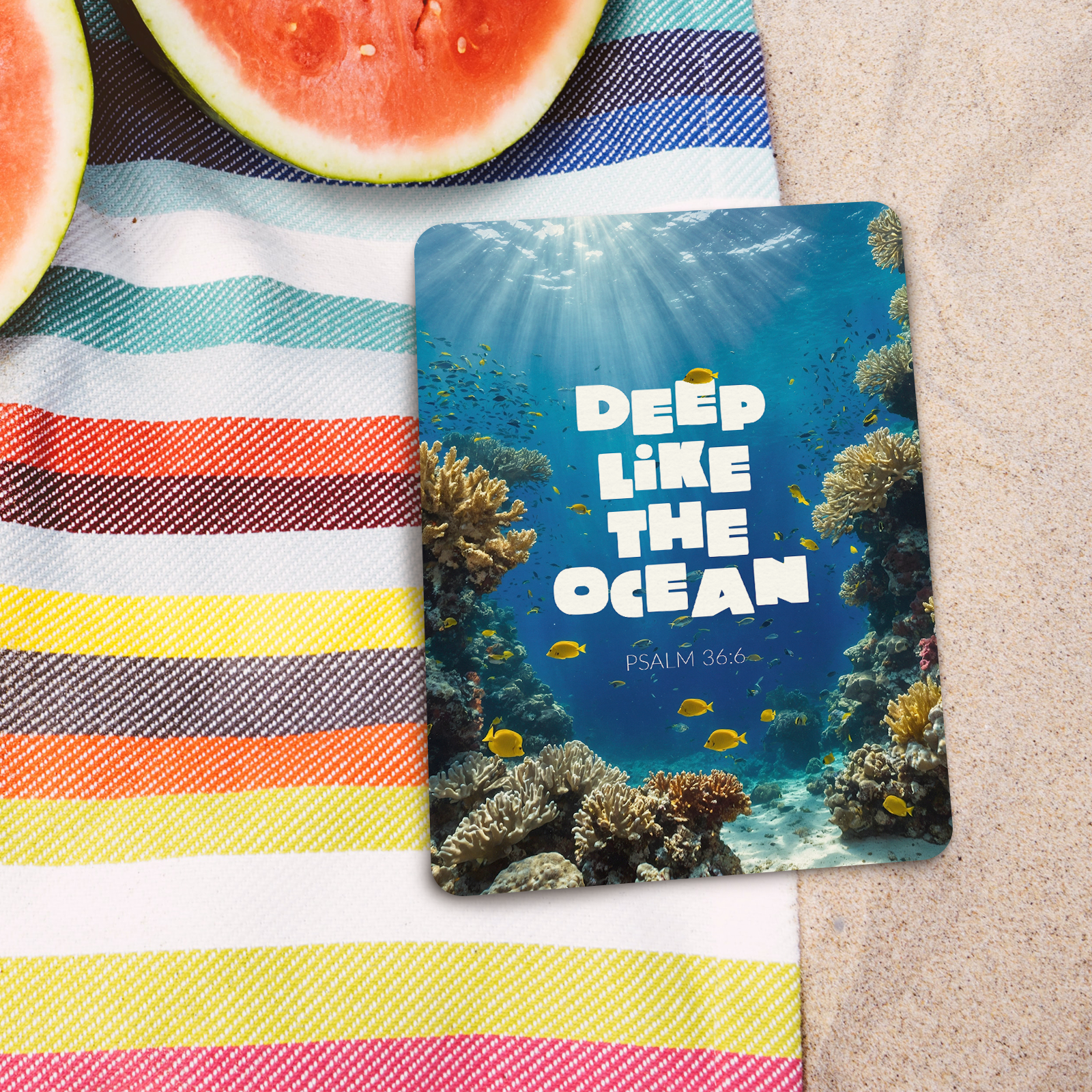 Ein farbenprächtiges Unterwassermotiv voller Tiefe und Weite fängt die majestätische Schönheit des Ozeans ein. Der Vers aus Psalm 36:6 erinnert an die unermessliche Größe von Gottes Liebe und Treue. Eine eindrucksvolle Karte für viele Gelegenheiten.