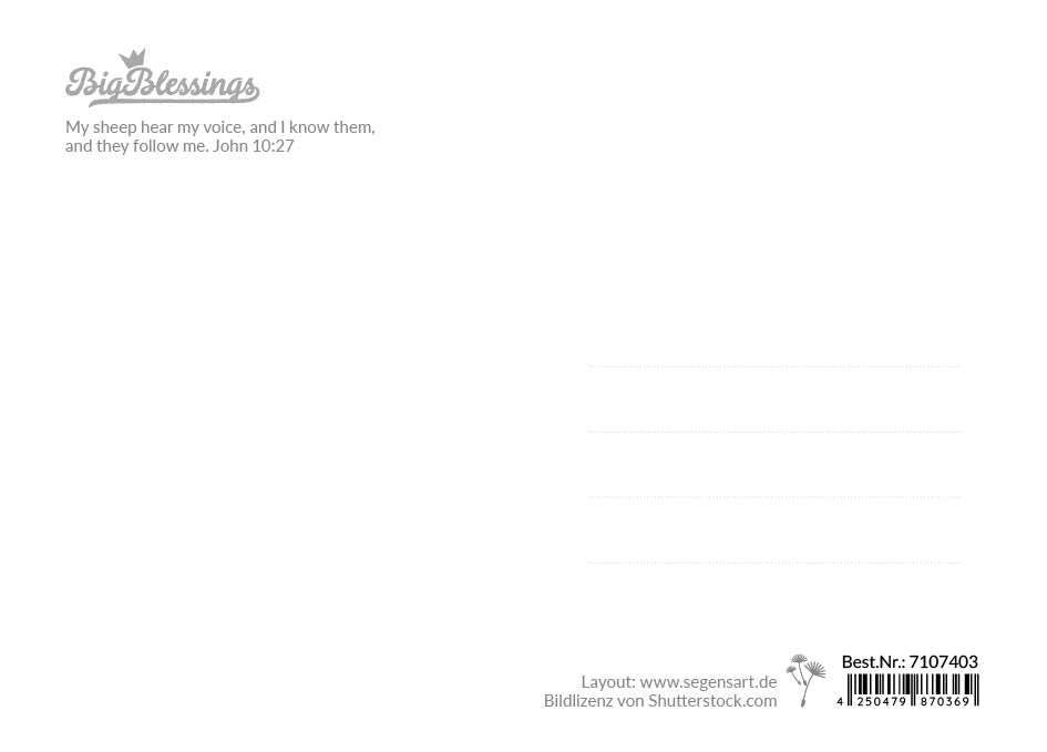 Ein friedvolles Landschaftsmotiv mit grasenden Schafen und weiten Berglinien bildet den Hintergrund für diese kraftvolle biblische Zusage aus Johannes 10:27. Die Postkarte erinnert daran, dass Gott spricht – liebevoll, klar und führend. Perfekt als Karte zur Ermutigung oder als Geschenk für besondere Momente.