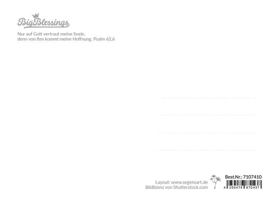 Ein beeindruckendes Bergmotiv symbolisiert Stärke, Standhaftigkeit und Zuversicht. Der Vers aus Psalm 62,6 erinnert daran, dass Hoffnung allein aus Gottes Hand kommt. Diese Karte ist ein idealer ermutigender Gruß für schwere Zeiten oder als inspirierender Geschenkzusatz.
