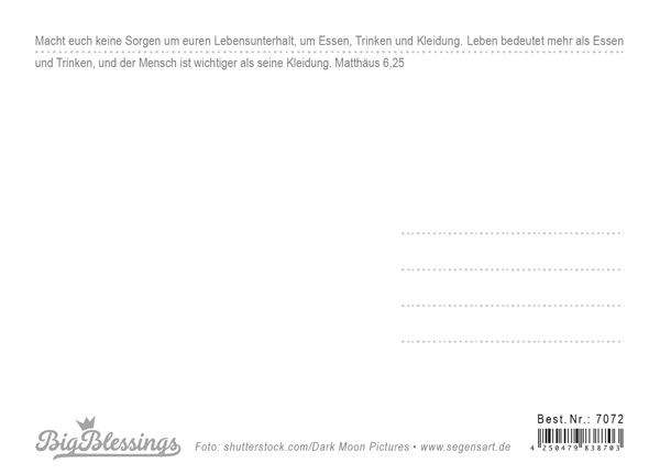 Macht euch keine Sorgen um euren Lebensunterhalt, um Essen, Trinken und Kleidung. Leben bedeutet mehr als Essen