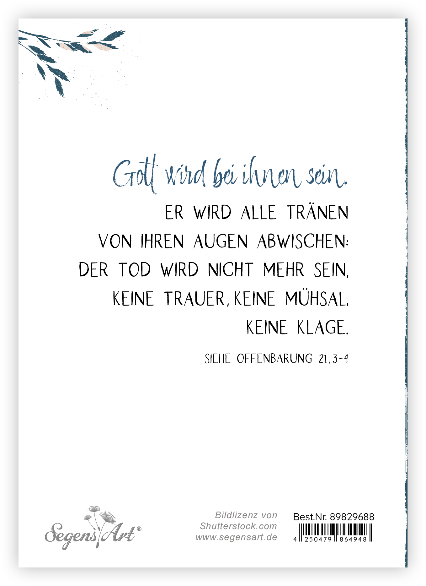 Faltkarte mit farbigem Umschlag und Hülle, im Format 10,5 x 14,8 cm (Format inkl. Umschlag 16 x 11,5 cm)Text:In stiller TrauerRückseite:Gott wird bei ihnen sein.Er wird alle Tränen von ihren Augen abwischen. Der Tod wird nicht mehr sein, keine Trauer, keine Mühsal, keine Klage.Siehe Offenbarung 21, 3–4