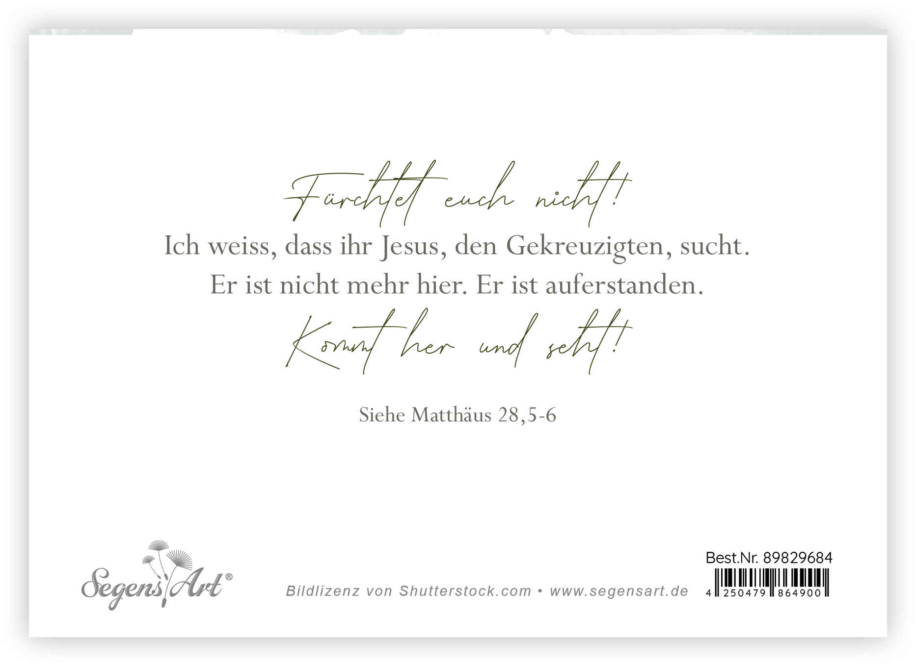 Faltkarte mit farbigem Umschlag und Hülle, im Format 14,8 x 10,5 cm (Format inkl. Umschlag 16 x 11,5 cm)Text:Frohe OsternJesus ist auferstanden, Halleluja.Rückseite:Fürchtet euch nicht! Ich weiss, dass ihr Jesus, den Gekreuzigten, sucht.Er ist nicht mehr hier. Er ist auferstanden.Kommt her und seht! Siehe Matthäus 28,5-6