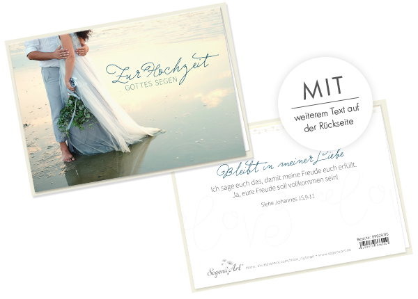 Faltkarte mit farbigem Umschlag und Hülle, im Format 14,8 x 10,5 cm (Format inkl. Umschlag 16 x 11,5 cm)Text:Zur Hochzeit Gottes SegenRückseite:Bleibt in meiner Liebe.Ich sage euch das, damit meine Freude euch erfüllt. Ja, eure Freude soll vollkommen sein!Siehe Johannes 15,9-11