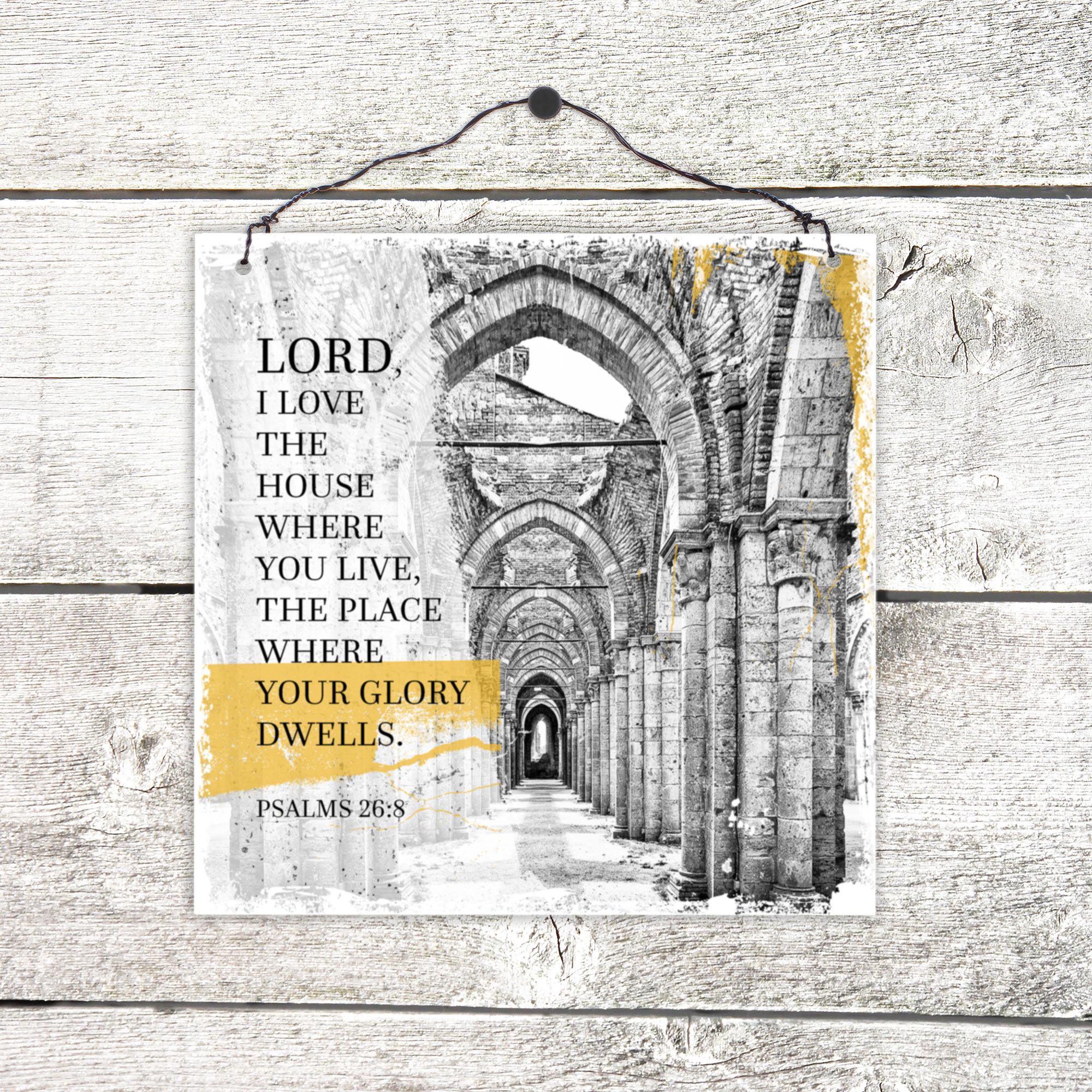 Holzschild im Format 13 x 13 cm, für trockene Innenräume geeignet.Mit doppeltem Draht zum Aufhängen und zusätzlicher Aufstellmöglichkeit - Es wird ein Holzstift mitgeliefert, der einfach auf der Rückseite angebracht werden kann.Handmade - Die Holzschilder werden hier vor Ort von uns produziert.Text:Lord, I love the house where you live, the place where your glory dwells.Psalms 26:8