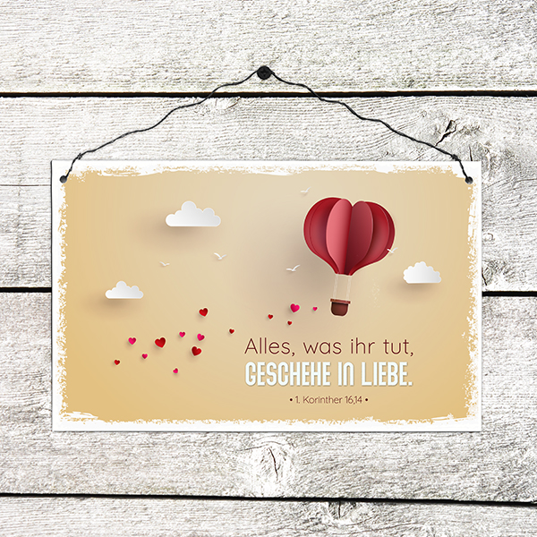 Holzschild im Format 21 x 13 cm, für trockene Innenräume geeignet.Mit doppeltem Draht zum Aufhängen und zusätzlicher Aufstellmöglichkeit - Es wird ein Holzstift mitgeliefert, der einfach auf der Rückseite angebracht werden kann.Handmade - Die Holzschilder werden hier vor Ort von uns produziert.Text:Alles, was ihr tut, geschehe in Liebe.