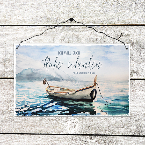Holzschild im Format 21 x 13 cm, für trockene Innenräume geeignet.Mit doppeltem Draht zum Aufhängen und zusätzlicher Aufstellmöglichkeit - Es wird ein Holzstift mitgeliefert, der einfach auf der Rückseite angebracht werden kann.Handmade - Die Holzschilder werden hier vor Ort von uns produziert.Text:Ich will euch Ruhe schenken.