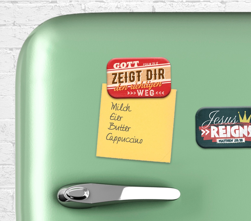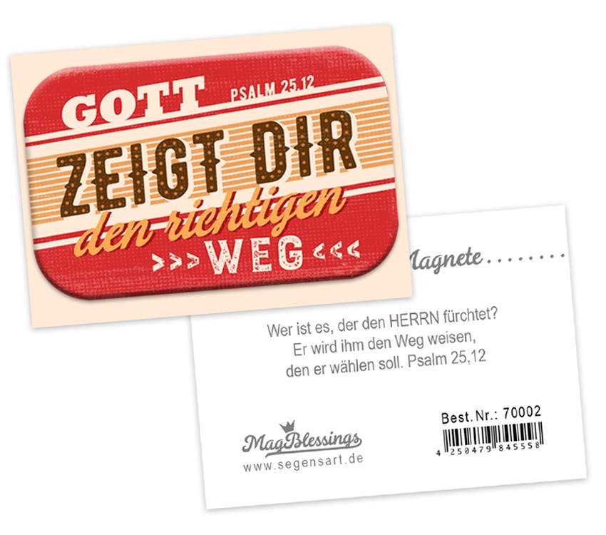 Der Magnet und ein farbiges Kärtchen mit Bibelzitat auf der Rückseite sind zusammen in einer Folie verpackt.