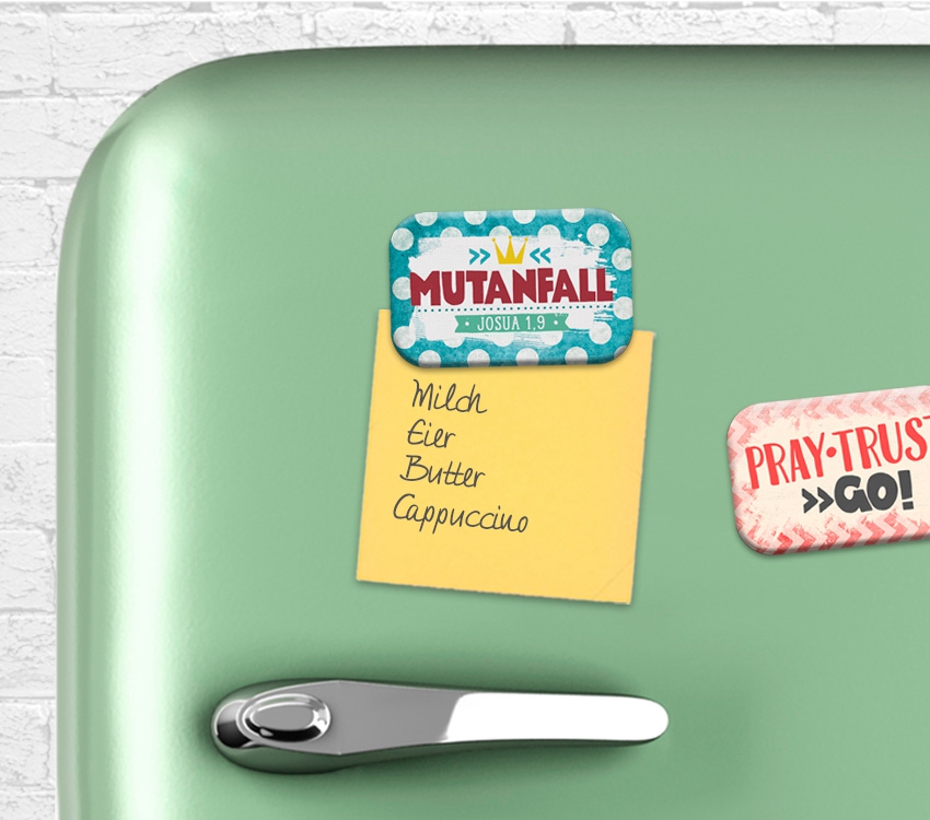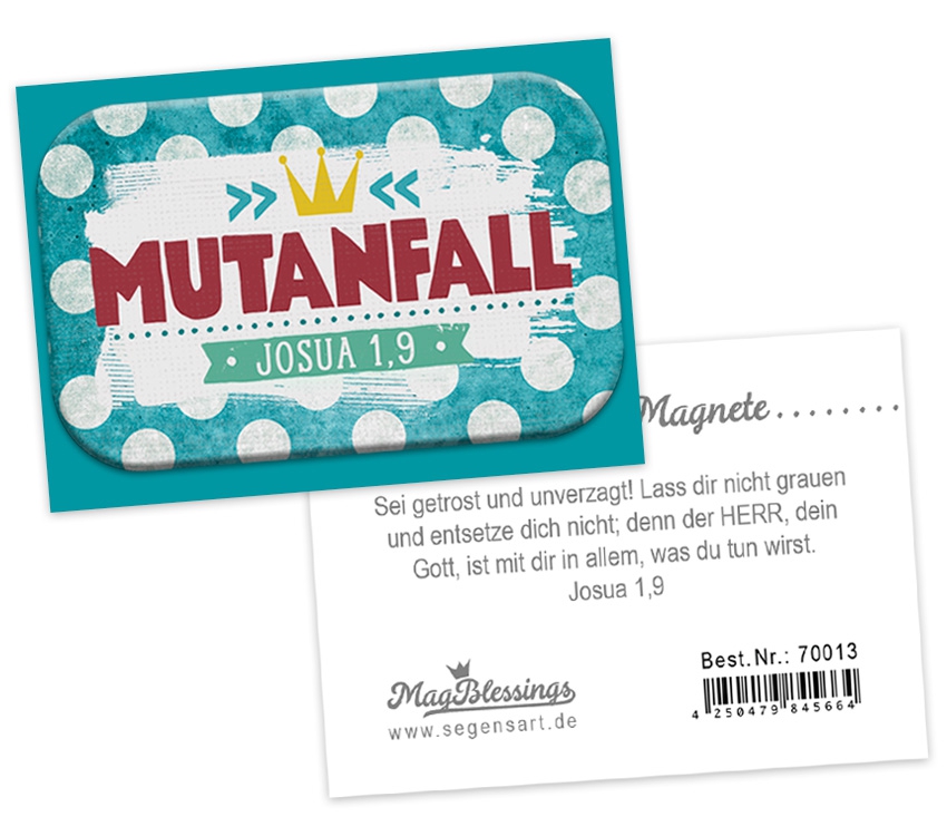 Der Magnet und ein farbiges Kärtchen mit Bibelzitat auf der Rückseite sind zusammen in einer Folie verpackt.