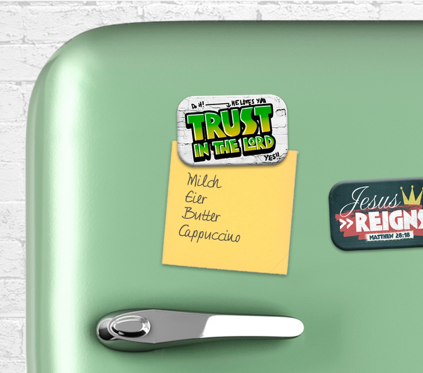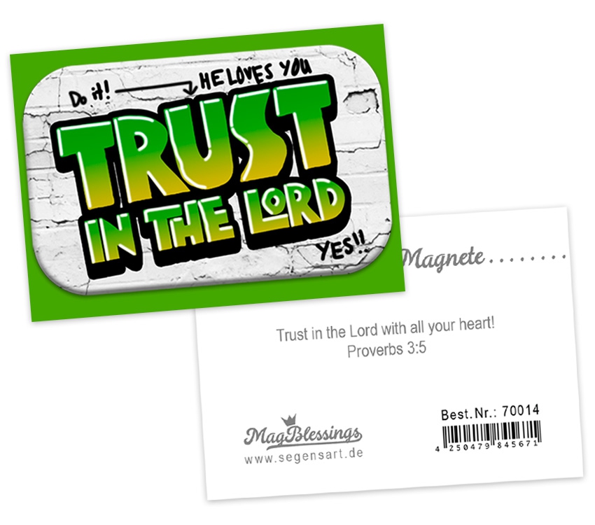 Der Magnet und ein farbiges Kärtchen mit Bibelzitat auf der Rückseite sind zusammen in einer Folie verpackt.