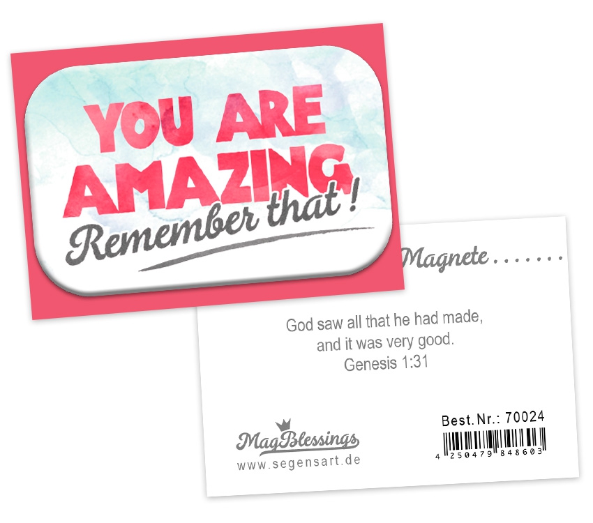 Der Magnet und ein farbiges Kärtchen mit Bibelzitat auf der Rückseite sind zusammen in einer Folie verpackt.