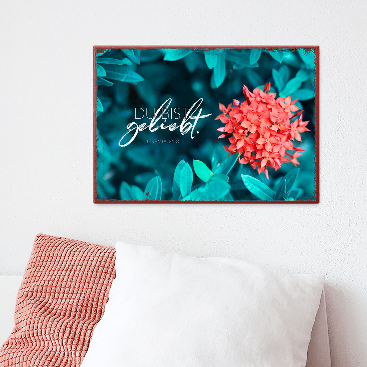 Metallschild im Vintage-Look im Format 27 x 19 cm, für trockene Innenräume geeignet, zum AufhängenHandmade - Die Metallschilder werden hier vor Ort von uns produziert.Text:Du bist geliebt.