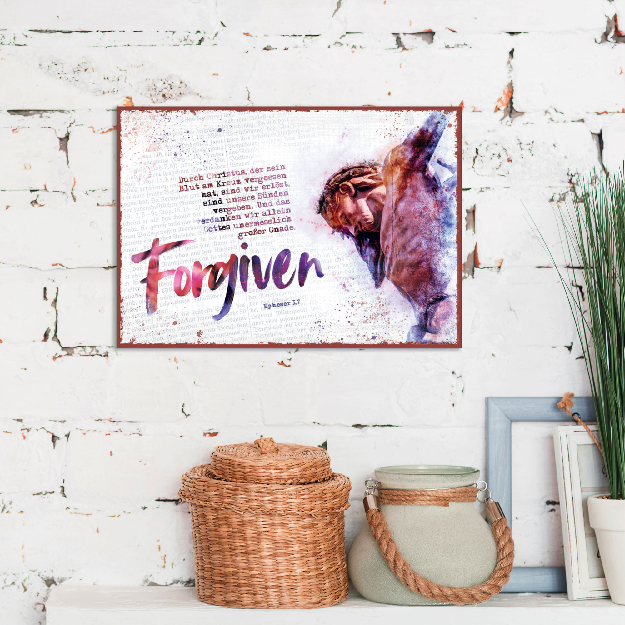 Metallschild im Vintage-Look im Format 27 x 19 cm, für trockene Innenräume geeignet, zum AufhängenHandmade - Die Metallschilder werden hier vor Ort von uns produziert.Text:ForgivenDurch Christus, der sein Blut am Kreuz vergossen hat, sind wir erlöst, sind unsere Sünden vergeben. Und das verdanken wir allein Gottes unermesslich großer Gnade.Epheser 1,7
