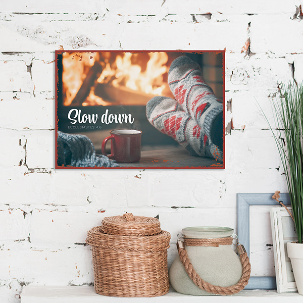 Metallschild im Format 27 x 19 cm, für trockene Innenräume geeignet, zum AufhängenHandmade - Die Metallschilder werden hier vor Ort von uns produziert.Text:Slow down
