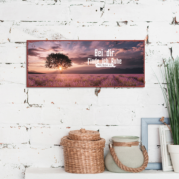 Metallschild im Vintage-Look im Format 34,5 x 14 cm, für trockene Innenräume geeignet, zum AufhängenHandmade - Die Metallschilder werden hier vor Ort von uns produziert.Text:Bei dir finde ich Ruhe.