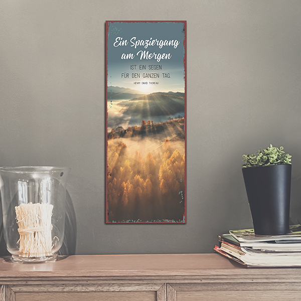 Metallschild im Format 34,5 x 14 cm, für trockene Innenräume geeignet, zum AufhängenHandmade - Die Metallschilder werden hier vor Ort von uns produziert.Text:Ein Spaziergang am Morgen ist ein Segen für den ganzen Tag.