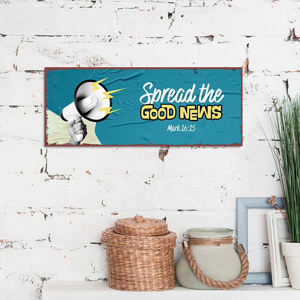 Metallschild im Format 34,5 x 14 cm, für trockene Innenräume geeignet, zum AufhängenHandmade - Die Metallschilder werden hier vor Ort von uns produziert.Text:Spread the good news.