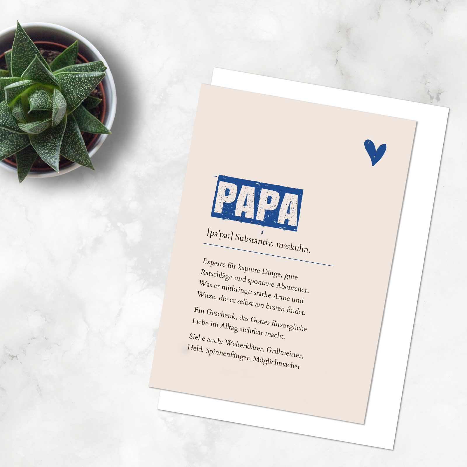 „Papa [paˈpaː] Substantiv, maskulin. Experte für kaputte Dinge, gute Ratschläge und spontane Abenteuer. Was er mitbringt: starke Arme und Witze, die er selbst am besten findet. Ein Geschenk, das Gottes fürsorgliche Liebe im Alltag sichtbar macht. Siehe auch: Welterklärer, Grillmeister, Held, Spinnenfänger, Möglichmacher“